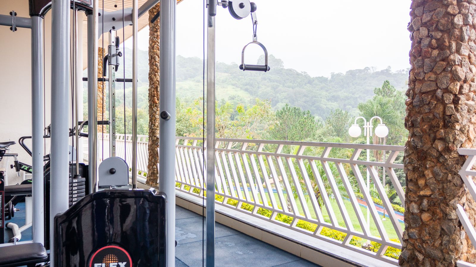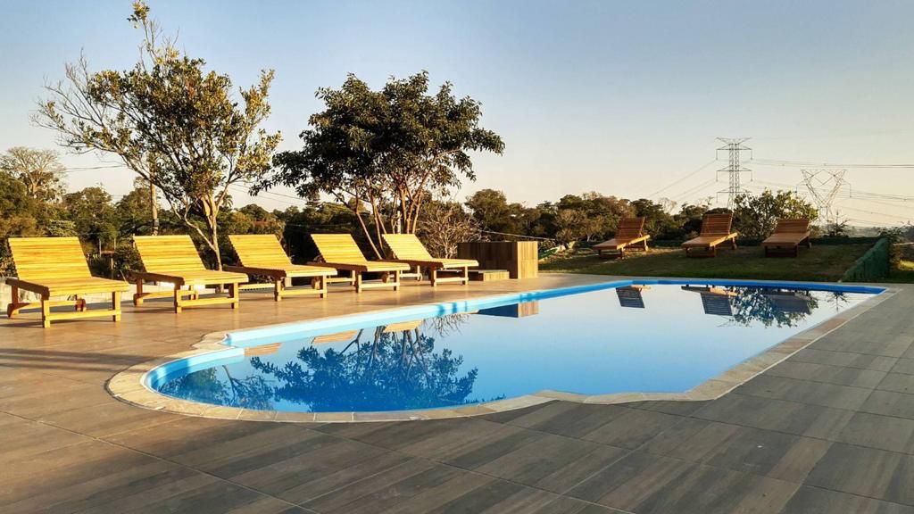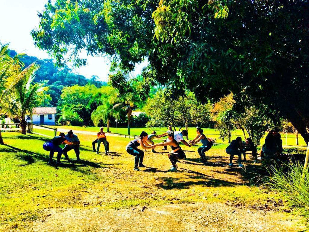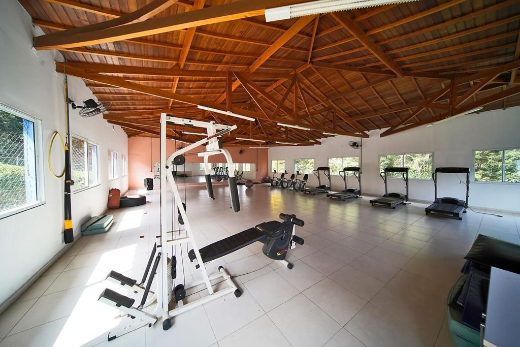 Ambientes equipados com piscina, academia, campo e quadra para esportes, refeitório, além de uma área ampla.